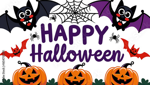 Obraz premium Cartoon bats spiders and pumpkins happy halloween text