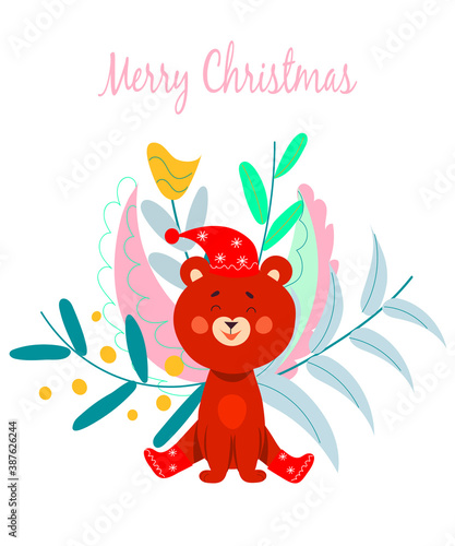 © Юлия Мурт, Naklejka premium Cartoon bear and flower background. Christmas card. Vector illustration.