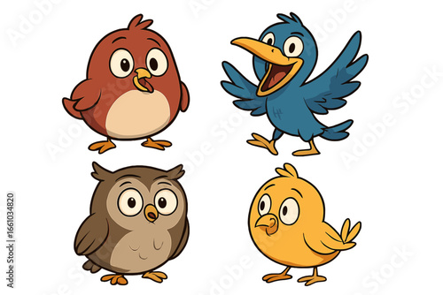 Fototapeta premium Cartoon Birds Collection. Cute Colorful Bird Characters. Happy Owl, Robin, Crow, Chick Vector Illustration. Fun Animal Mascots. Playful Avian Designs for Children. Isolated EPS Clipart.