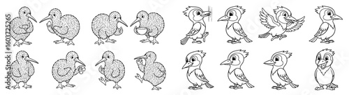 Naklejka premium Cartoon birds in different poses. Bird, kiwi, cute, characters, drawing, funny, comic, animals, illustration, mascot, graphic, design, outline.