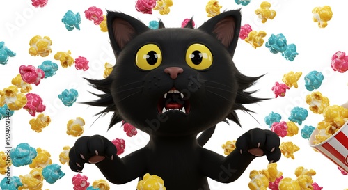 Fototapeta premium Cartoon black cat surrounded by popcorn
