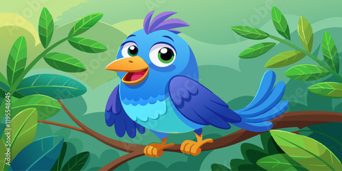 © Najmul Design Hub, Obraz premium Cartoon Blue Bird with Cheerful Expression Perched on Branch in Vibrant Colors