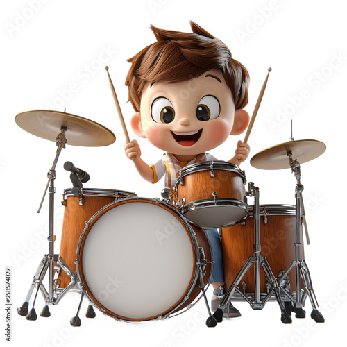 © wiwat apisithpinyo, Fototapeta premium Cartoon Boy Playing Drums with Sticks and Cymbals