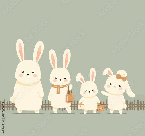 Fototapeta premium Cartoon Bunny Family with Bags by Fence
