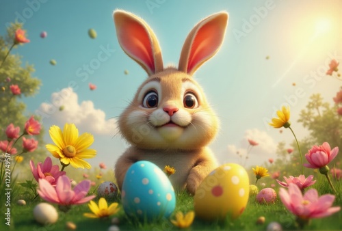Obraz premium Cartoon Bunny with Easter Eggs and Flowers