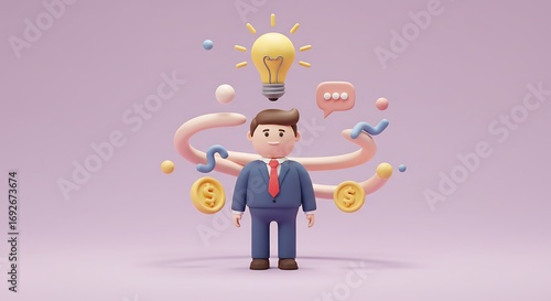 © Ayasha, Obraz premium Cartoon Businessman Character with Lightbulb Symbolizing Innovation and Financial Growth Representing Business Ideas and Solutions for Success and Wealth on Pastel Background