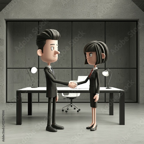 Fototapeta premium Cartoon Businessmen Shaking Hands in Professional Suits in a 3D Style, Symbolizing Partnership
