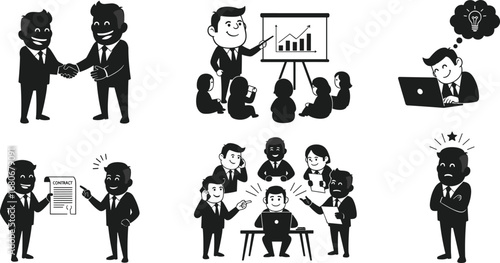 © Sabbir's World, Obraz premium Cartoon businesspeople working, presenting, shaking hands, signing contracts, solving problems, teamwork, office communication, thinking ideas, feedback, corporate stress, leadership