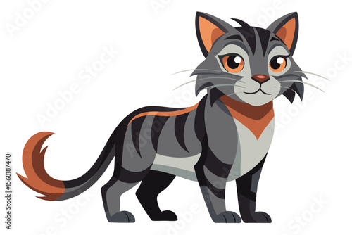 © Bablu, Obraz premium Cartoon Cat with Stripes and Orange Accents Standing Proudly on a White Background
