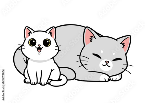Obraz premium Cartoon Cats: White Kitten Smiling Beside Sleeping Gray Cat Illustration.