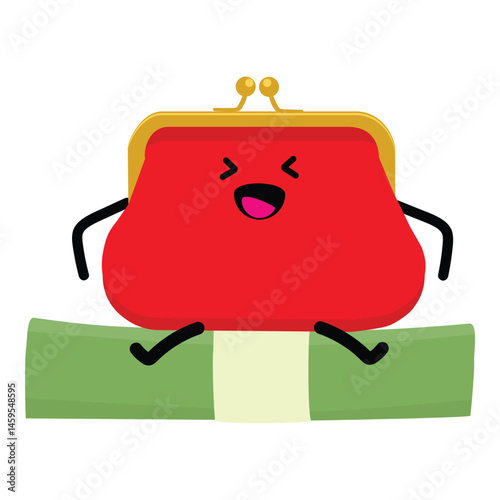 Obraz premium Cartoon character funny red purse, wallet sitting on banknote stack, dollar bundle isolated on white background. Money
