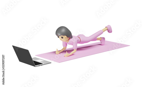 © sirawut, Fototapeta premium cartoon character women doing exercise style yoga on rubber mat with watching online tutorials on laptop. 3d illustration or 3d render