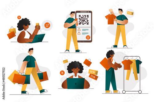 © Ruslan, Naklejka premium Cartoon charactes with shopping bags. Happy people buys clotches. Vector eps10 template. Set of illustartions of online shopping. Modern vector. Women and men