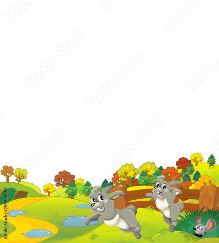Naklejka premium Cartoon charakter farmy wiejskiej słonecznej sceny dla różnych zastosowań i niektórych zwierząt z białym tłem - ilustracja dla dzieci