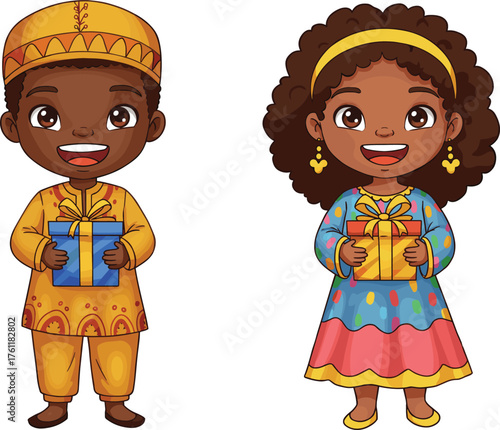 Naklejka premium Cartoon children cultural costumes, traditional dress, gift box, festive celebration, colorful outfit, cheerful pose, smiling, diversity, standing, joyful