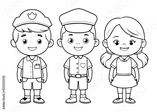 Fototapeta premium Cartoon Children in Uniforms A Black and White Coloring Page for Young Artists