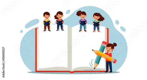Naklejka premium Cartoon Children Reading and Writing on Large Book