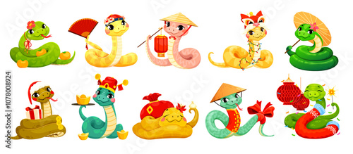 © Vector Tradition, Naklejka premium Cartoon 2025 Chinese lunar New Year snake characters for Asian holiday, vector emoji. Funny snakes in traditional Chinese costumes with paper light lanterns for 2025 year calendar and Chinese New Year