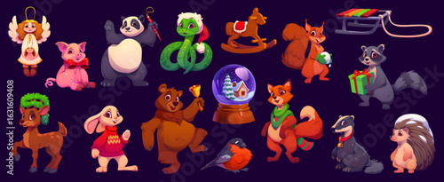 Obraz premium Cartoon Christmas animal characters. Vector festive set of fox, panda, angel, reindeer, rabbit, raccoon, bear and snake. Pig, hedgehog, squirrel with holiday props like sleigh, snow globe and gift