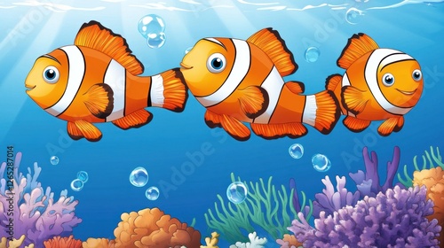 © Umi Sakina, Fototapeta premium Cartoon clownfish swim coral reef ocean