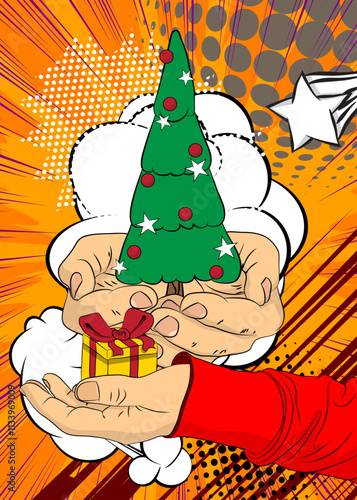 Obraz premium Cartoon, comic book human hands holding Gift Box and Christmas decorated pine...