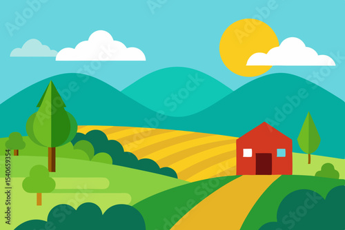 © Rashada, Fototapeta premium Cartoon countryside landscape with house and mountains