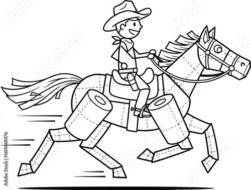 © Tasawar, Fototapeta premium Cartoon cowboy riding horse coloring page vector illustration for kids activity sheet design