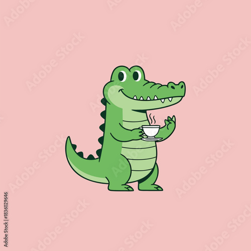 Obraz premium Cartoon crocodile enjoying a cup of tea.