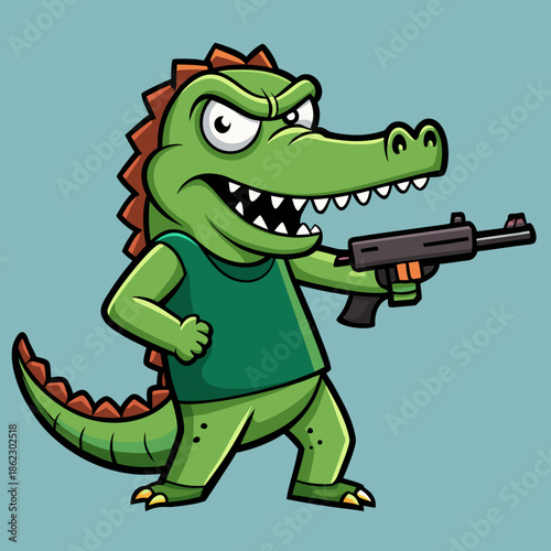 © Yasin, Fototapeta premium Cartoon crocodile holding gun in aggressive stance