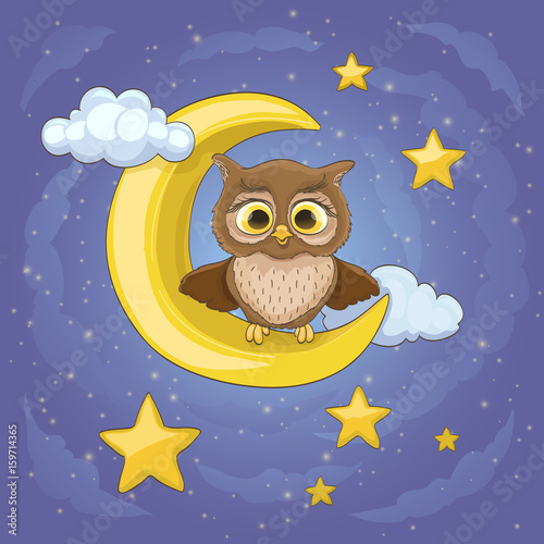 Naklejka premium cartoon cute baby owl sitting on a moon and stars with clouds. vector...