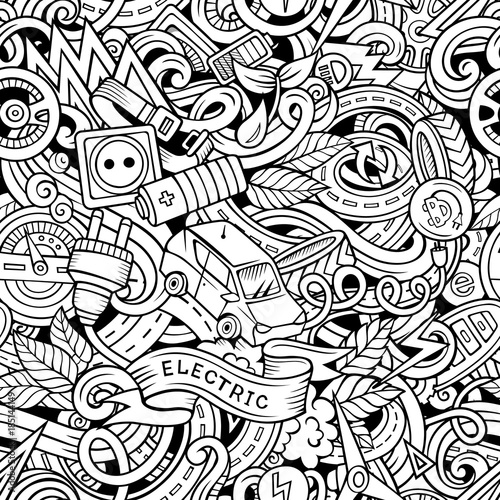 Fototapeta premium Cartoon cute doodles hand drawn Electric vehicle seamless pattern