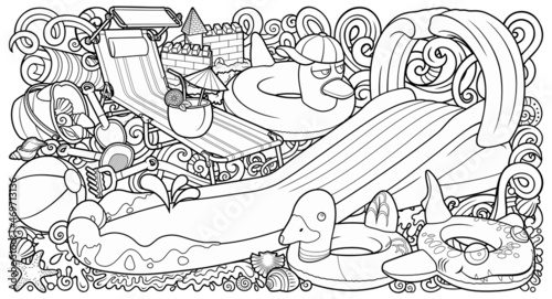 Fototapeta premium Cartoon cute doodles hand drawn summer beach children's entertainment...