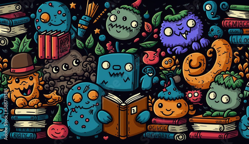 © Starlight, Obraz premium Cartoon cute doodles library seamless pattern Generative AI