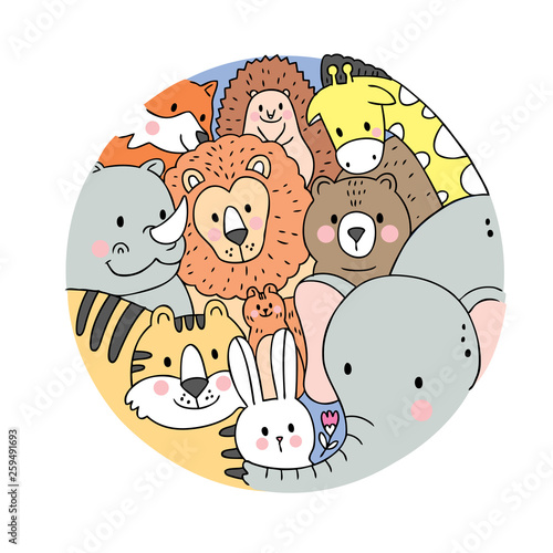 Obraz premium Cartoon cute face wildlife animals vector. Doodle circle frame.