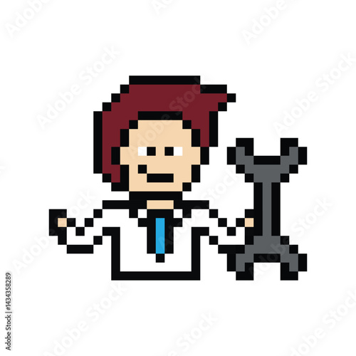 Obraz premium Cartoon cute pixel 8bit character engineer man fix problem improvement for...