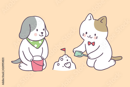 Fototapeta premium Cartoon cute summer cat and dog playing vector.