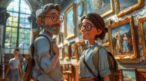 © GenerativeAIpicture, Obraz premium Cartoon 3D tourists enjoying a guided tour in a museum