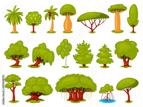 Fototapeta premium Cartoon deciduous and coniferous trees. Stylized forest botany, different plant species, natural elements of game landscape, park decorative objects, woodland season vector flat isolated set