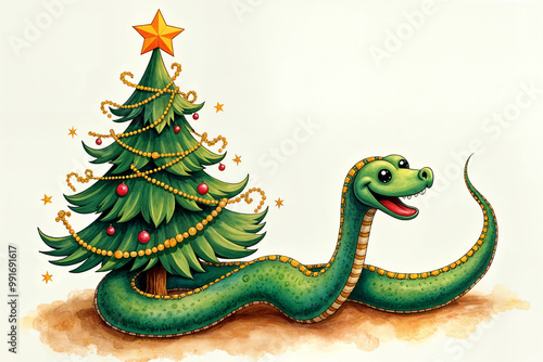 © Aleksei Solovev, Naklejka premium Cartoon depiction of a green snake with a Christmas tree on its back, adorned with ornaments and a star on top.