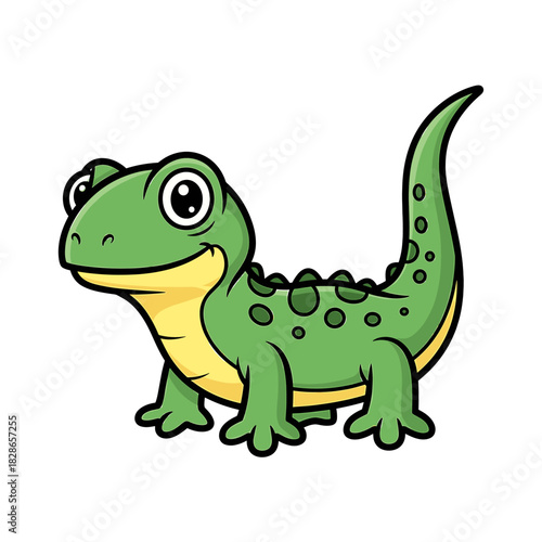 Naklejka premium Cartoon depiction of a smiling green lizard with spots and a yellow belly, standing on all fours.