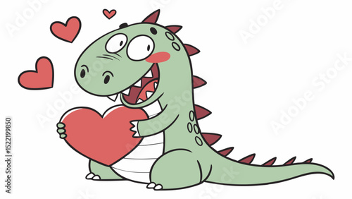© Aryazu, Obraz premium Cartoon Dinosaur Holding a Heart with Floating Hearts