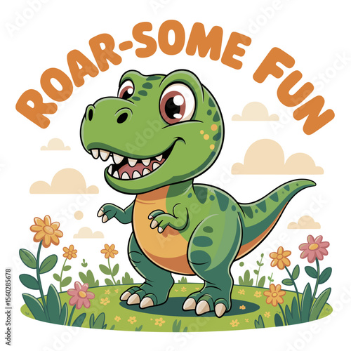 Naklejka premium Cartoon dinosaur, roar-some fun, cute reptile on grass with flowers and...