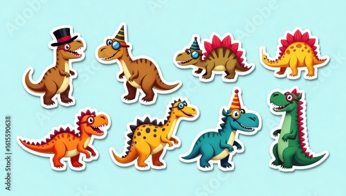 © Ikhsan, Fototapeta premium Cartoon dinosaurs wearing party hats and glasses.