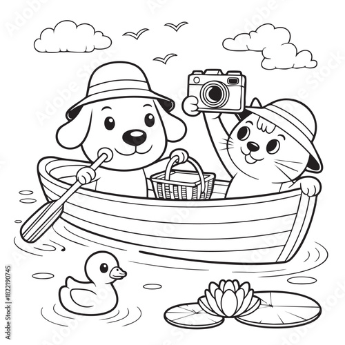 Obraz premium Cartoon dog and cat in a boat with a duck and water lily Keywords: dog, cat, boat, canoe, paddle, water, river, lake, duck, duckling, water lily, flower, nature, animals, pets, friends, cartoon