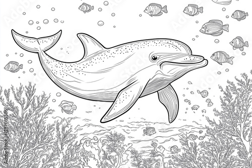 Fototapeta premium Cartoon dolphin swimming underwater with smaller fish for coloring book pages