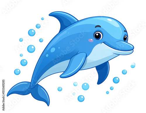 Fototapeta premium Cartoon Dolphin Swimming with Smile and Bubbles, Front View, Isolated on...