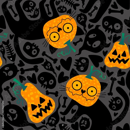 Fototapeta premium Cartoon doodle Halloween seamless cats and pumpkins and skulls and bones pattern for wrapping paper