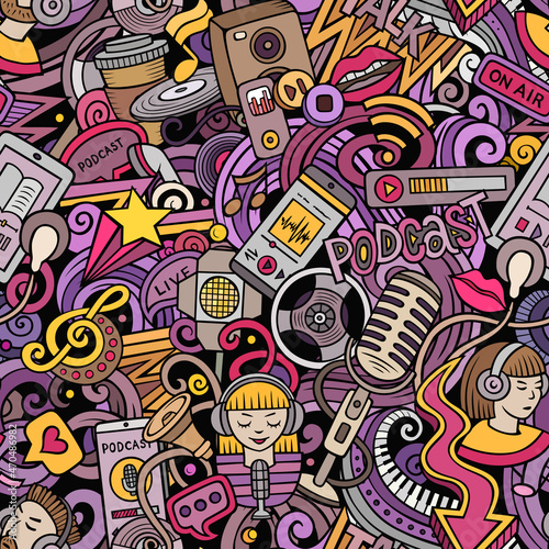© balabolka, Obraz premium Cartoon doodles Audio content seamless pattern.