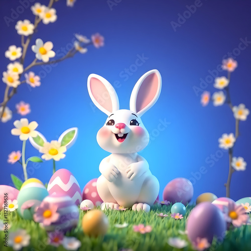 © Joshua, Fototapeta premium Cartoon Easter bunny with eggs and flowers. Digital illustration. Holiday theme