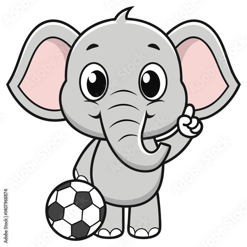 Fototapeta premium Cartoon Elephant Holding a Football, Gesturing Upward with Finger, on White